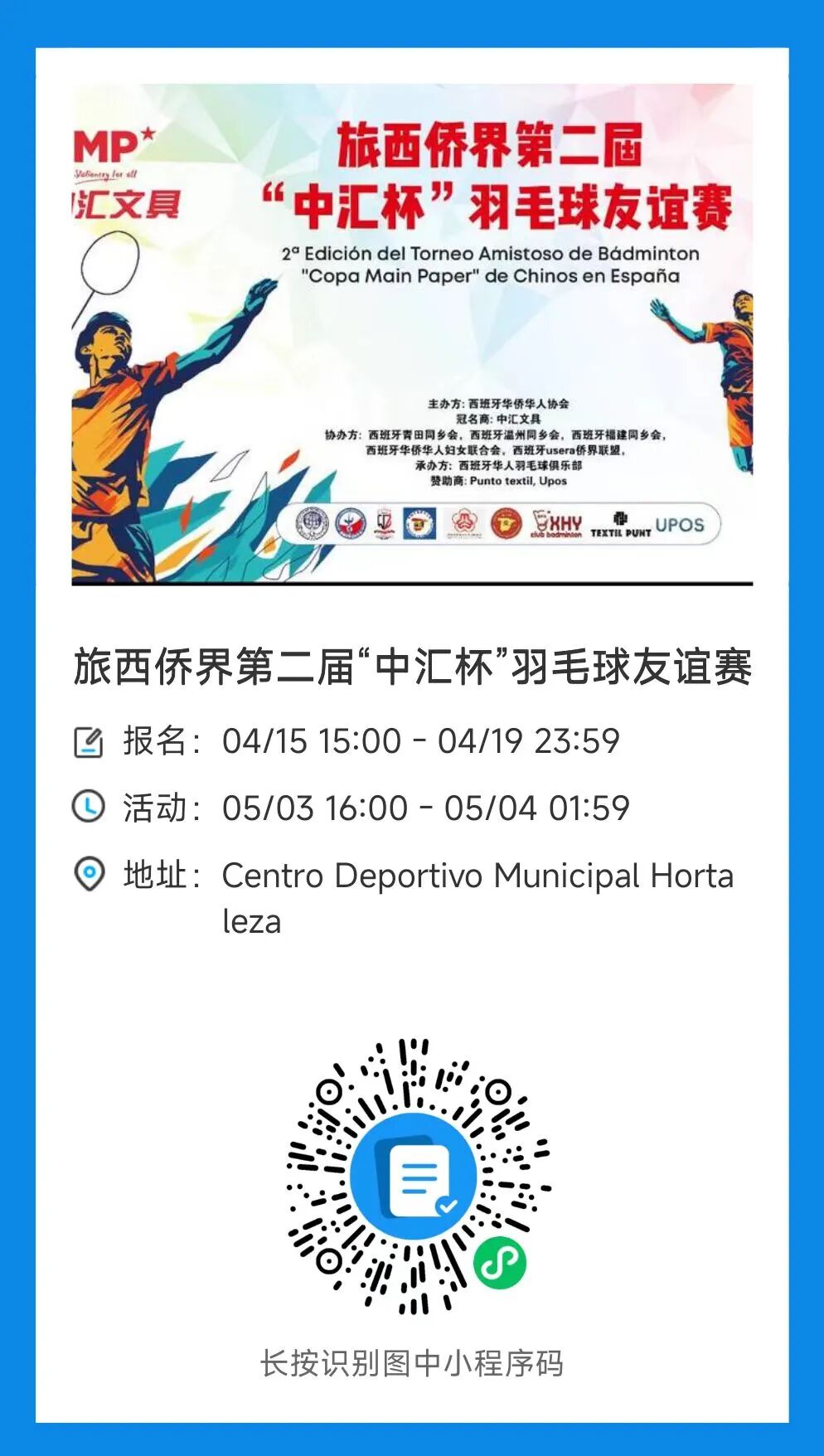 春暖花开,生机盎然,在这个充满活力的季节,为了进一步丰富旅西侨胞的文化体育生活,增强侨界凝聚力,旅西侨界第二届“中汇杯”羽毛球友谊赛将于2026年5月3日在马德里 Hortaleza 体育中心隆重举行。